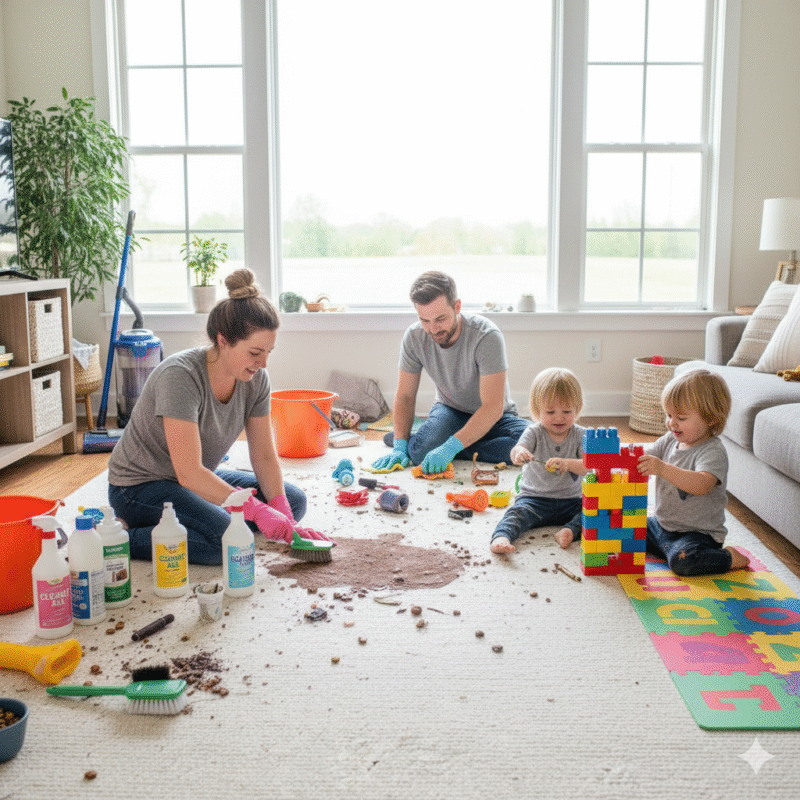 •Residuos en Superficies: Compuestos como los amonio cuaternarios (comunes en desinfectantes) o los fosfatos pueden quedar en pisos, encimeras y juguetes. Cuando un niño gatea o una mascota lame el suelo, estos residuos son transferidos directamente al organismo.
