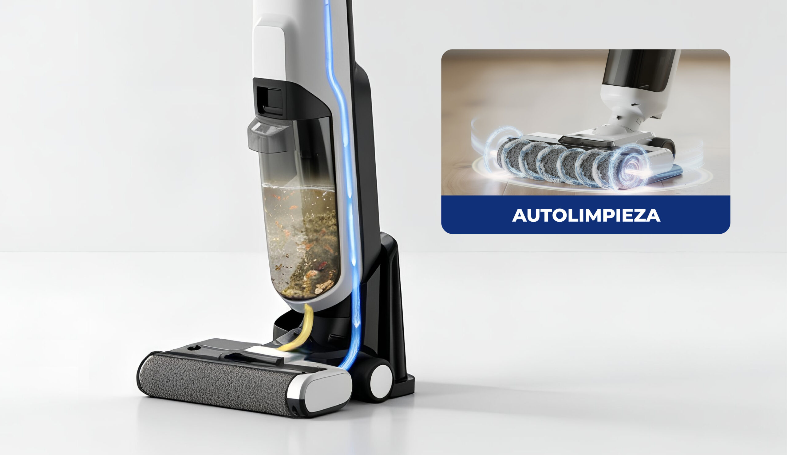 Su sistema de doble acción aspira y trapea al mismo tiempo, dejando el suelo impecable a la primera. Con potencia de succión optimizada y flujo de agua controlado, no arrastra la mugre: la borra. Así de simple.