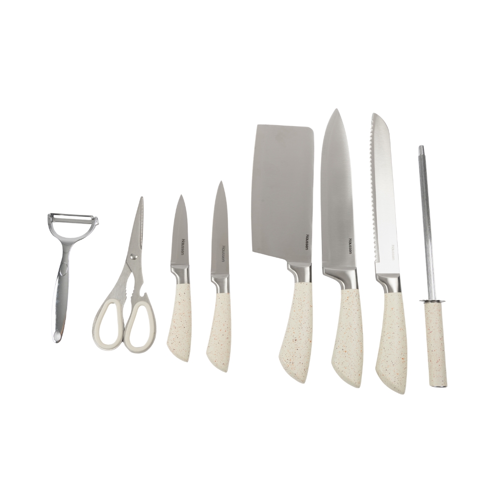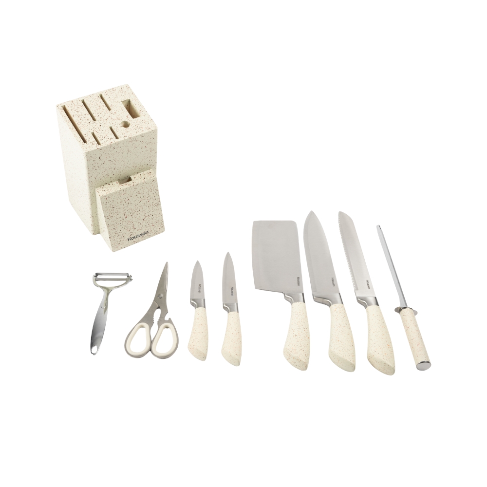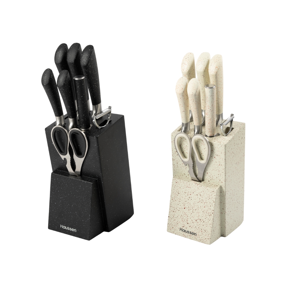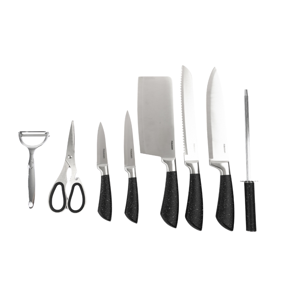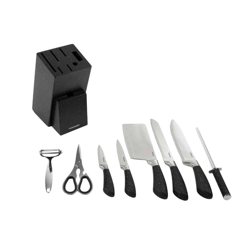 Todo lo que necesitas en un solo set: cuchillos de precisión, tijeras, pelador y afilador, listos para acompañarte en cada preparación, desde el corte más fino hasta el más exigente.